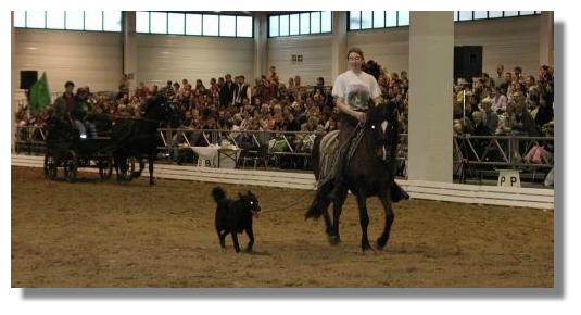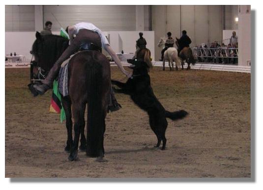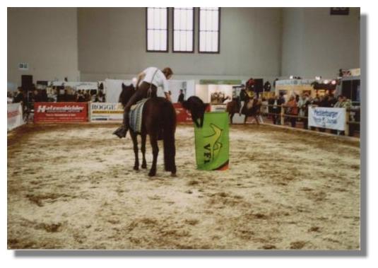Am Mittwoch dann sollte es losgehen. Wir hatten uns am Nachmittag auf dem Messegelände verabredet. Doch was herrschte dort für ein Durcheinander! Autos ohne Ende und kein Mensch wußte so richtig wo er hin mußte. Nach Stunden war es dann endlich soweit, wir hatten uns gefunden und schon fast in der Nacht durften wir zum 1.Mal in den Ring, um gemeinsam unser Schaubild zu proben! Wenn man bedenkt, dass unsere Pferde fast den ganzen Tag auf dem Transporter standen und dann in den Messehallen eine enge Box bezogen, in einer für sie völlig ungewohnten Umgebung, um dann noch spätabends mit fremden Pferden eine Schaunummer zu probieren, muß man sagen: