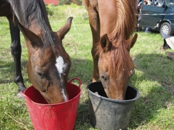 Es ist heiß an diesem Mittwoch. Verdammt. Sengend. Heiß. Und es gibt wenig Schatten an diesem Nachmittag. Wir machen es, wie Susanne es am Vorabend angeraten hat: Trinken, trinken, trinken und bei jeder Gelegenheit die Pferde tränken (auch Pfützen sind gut) und Nüstern, Hals, Bauch mit kühlem Wasser abschwämmen. Das Team richtet eine zusätzliche Pausenstation mit Getränken für Rosse und Reiter ein und das ist auch gut so!