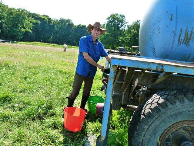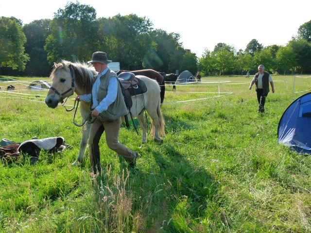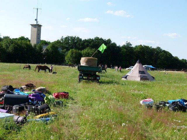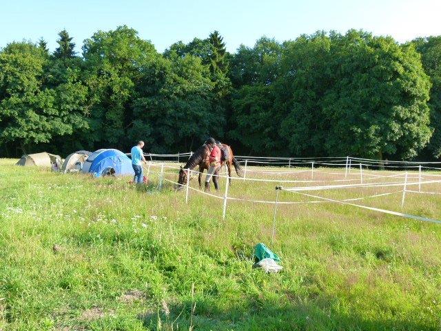 Wie vor einer Woche, kam ich gegen 13 h auf dem Gutshof an. Es bot sich auch fast dasselbe Bild: Blauer Brandenburg-Himmel, Pferdehänger und Zugfahrzeuge, Paddocks mit friedlich heumampfenden Pferden, der Wasserwagen und dazwischen Zelte und Grüppchen von Ritt-Teilnehmern.