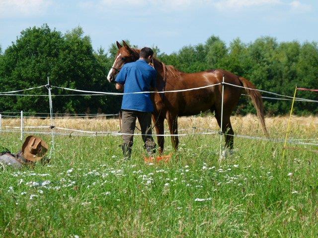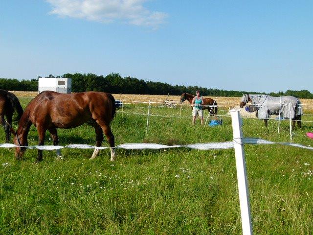 Und dann kamen als erste die beiden Reiter aus Baden-Württemberg mit ihrem Gespann an. Um 6 h waren sie gestartet. Jetzt war es so gegen 14 h. Kaum aus dem Auto, steckten sie die Paddocks ab, entluden die, trotz der langen Fahrt, völlig entspannt erscheinenden Pferde und setzten sich zu uns in den Schatten. Sie spendierten Marion und mir sogar eine Flasche Weißbier,alkoholfrei, was ich total nett fand. Gekühlt hätte es uns natürlich besser geschmeckt – aber das Wanderreiterleben ist halt hart.