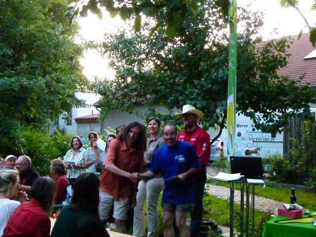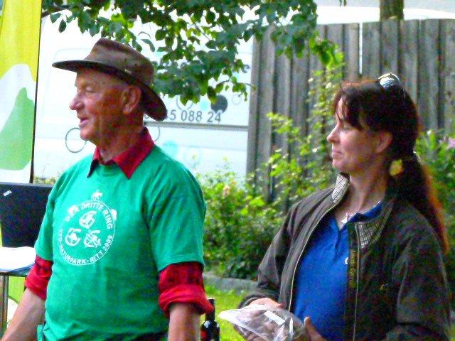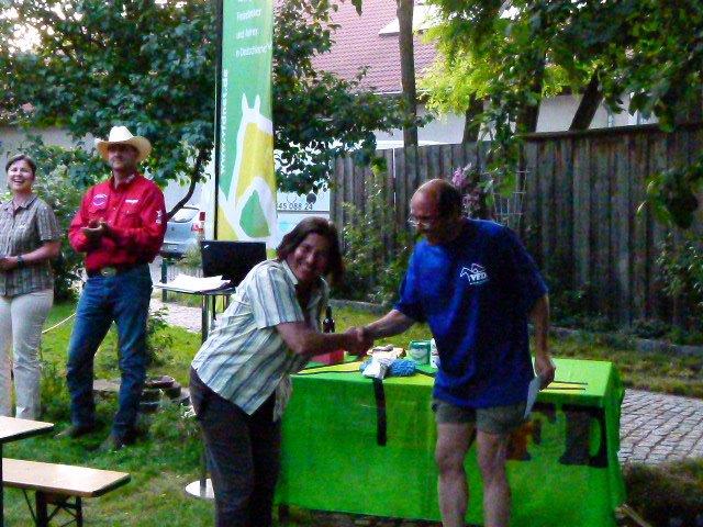 Die Siegerehrungen der Dressur und des Trails folgten, wobei mir die Startnummer 1 des Trails, Christian, mit seinem Reiterlied (verfaßt in Cooperation mit seinem musischen Freund), das er temperamentvoll und mitreißend vortrug, sodaß wir alle mitklatschten, besonders in Erinnerung blieb. (Sein siebenjähriges Fjordpferd Snorre konnte übrigens am Donnerstag den Ritt weiter mitmachen und ist wohlbehalten in Langerwisch angekommen. Christian hat die Trailprüfung mit ihm und mit seinem anderen Norweger, Lasse, 25 Jahre, den er Rittführerin Marion zur Verfügung gestellt hatte, mitgemacht!)