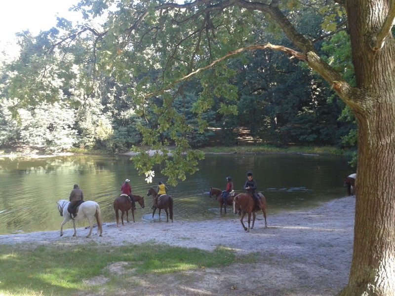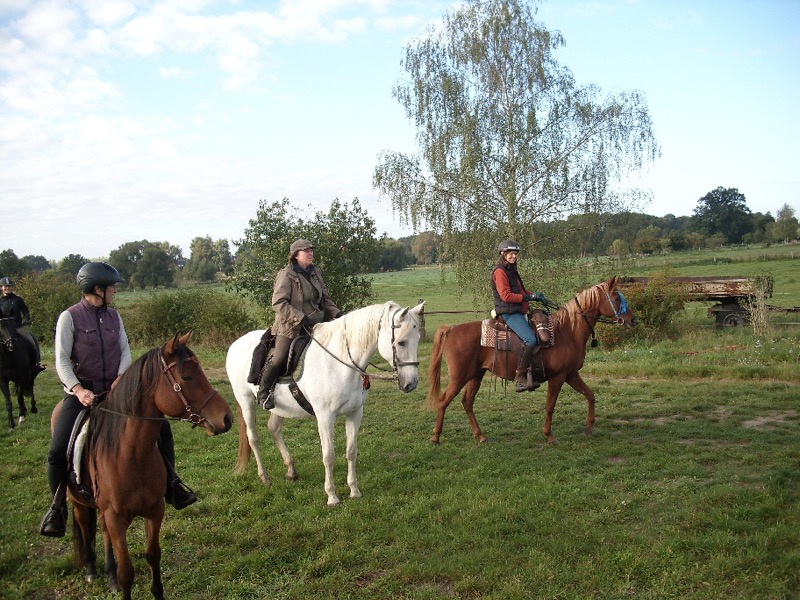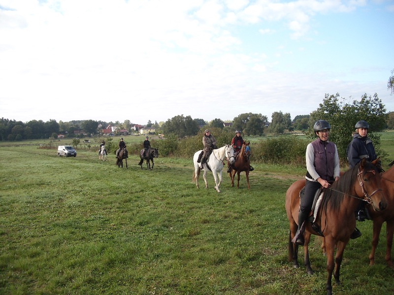 Die Pferde konnten ausgiebig Wasser trinken, das Ufer war breit genug, damit alle gleichzeitig an und in den See gehen konnten. Weiter gings bei sonnigem aber frischem Herbstwetter zum kleinen Ravensberg, wo sich die Gruppe erstmals trennte: Birgit Groth führte die „gemäßigten“ Reiter zum Naturschutzgebiet Moosfenn, während Ute mit der Galopp-Mannschaft eine andere Strecke wählte. Der Rückweg verlief über einen Berg- und Tal-Sandweg entlang der Bahnlinie. Die Pferde waren prima zu handhaben und vertrugen sich, auch wenn nicht alle Erfahrung mit größeren Gruppen hatten. Dank der umsichtigen Rittführung verliefen auch die Trab- und Galoppstrecken sehr zivilisiert. Nachdem die verschiedenen Teams in ihre Heimatställe in Langerwisch zurückgekehrt waren, versorgten die Gäste ihre Pferde auf Paddocks, die Ute zur Verfügung gestellt hatte. Anschließend traf man sich im örtlichen Lokal zum ausgiebigen Brunch, bei dem sich die Reiter auch über weitere VFDler freuten, die beim Ritt nicht dabei waren.