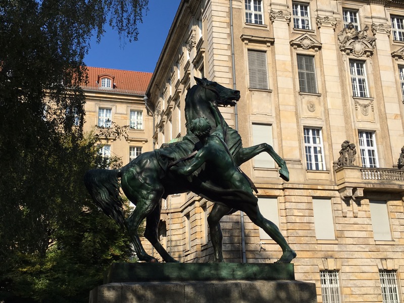 Kaum ein Herrscher, der sich nicht zu Pferde verewigen ließ, in einem Denkmal, das Macht und Souveränität symbolisiert. Im Bodemuseum zu Berlin steht die Reiterstatue des Großen Kurfürsten Friedrich Wilhelm – hier bekräftigt der Glanz des prächtigen Pferdes die Bedeutung seines Reiters. Auch Pferde ohne Reiter schmücken unsere Stadt, beispielsweise zwei große Standbilder vor dem Kammergericht am Kleistpark in Schöneberg mit den Namen: Rossebändiger (siehe Fotos).