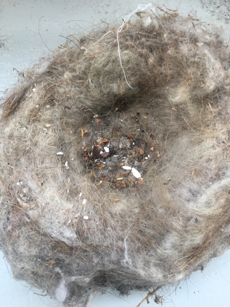 Bei diesem Nest, welches der Sturm vom Baum gerissen hat, ist die Verflechtung von groben Fasern bis zur feinen Wolle gut sichtbar.