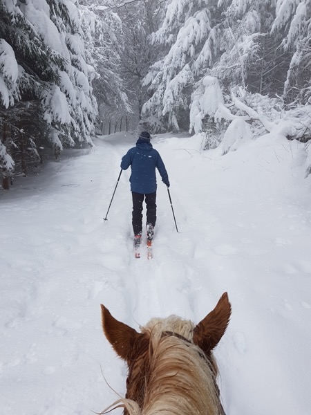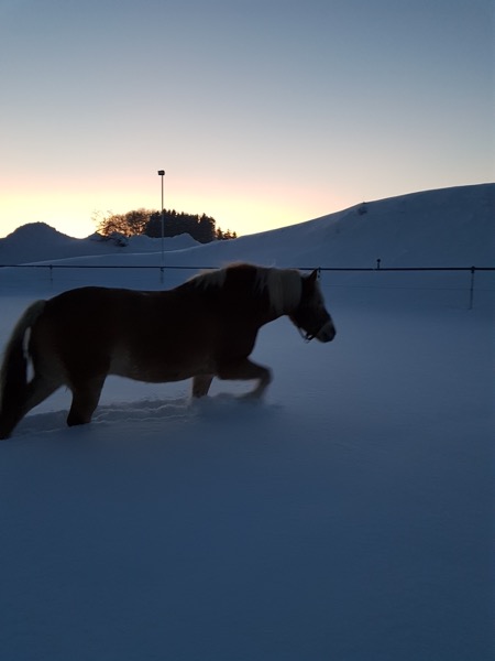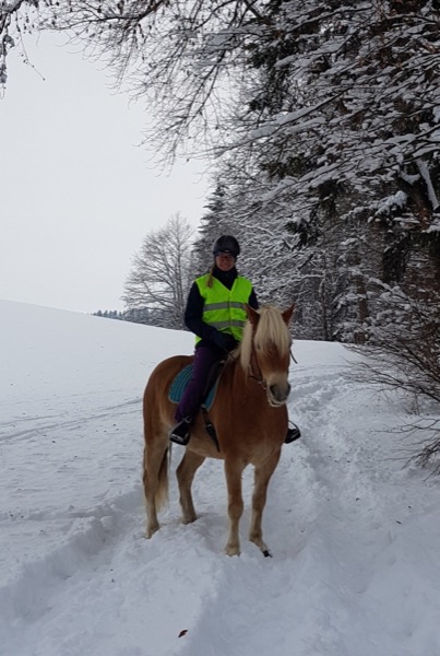 Damals in der Uckermark wohnend, zog es sie vor einigen Jahren in den Südwesten Deutschlands, also vom äußersten Nordosten über 700 Kilometer nach Oberschwaben. Dort liegt im Winter bekanntlich viel Schnee, und so kommt ihr Pferd Amadou jetzt in den Genuss von Tiefschnee auf seiner Koppel. Weil Hilke ihn auch fährt, wurde er mit Duplos beschlagen. Diese eignen sich allerdings nicht für Eisglätte oder auch nur eisigen Asphalt, so daß vorläufig an Kutschfahren nicht zu denken ist. Aber ein Ritt durch Winterwälder ist drin. Sogar mit einem Vorteil zu den anderen drei Jahreszeigen: die meisten Feldwege im Landkreis Ravensburg sind geschottert und so keine Freude für Pferdehufe, ob mit oder ohne Eisen. Aber beim Ausritt im weichen Schnee kein Problem. Eine herrliche Gelegenheit, sich mit frischer Luft und gesundem Panorama zu umgeben, was derzeit nur noch in der einsamen Natur möglich ist.