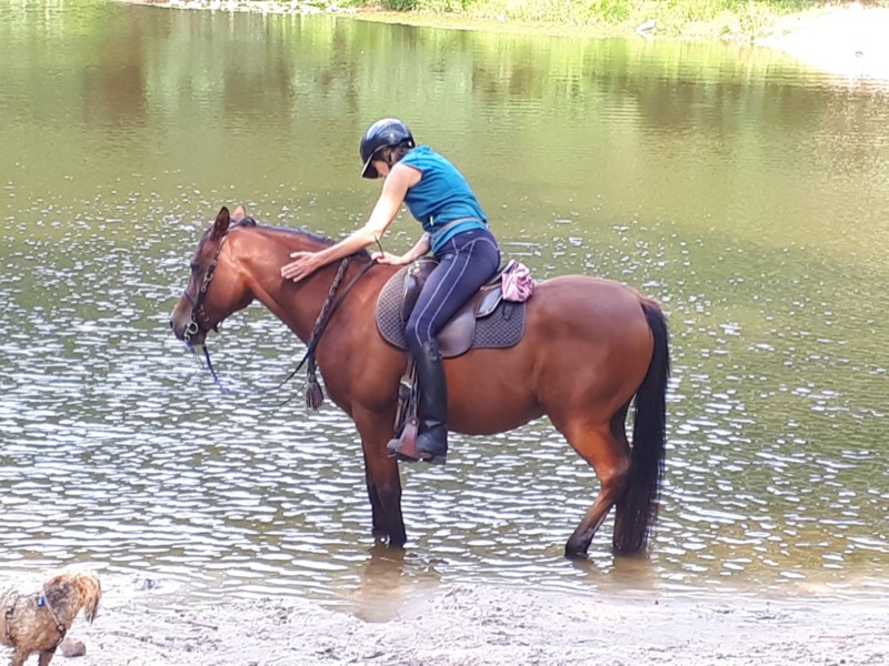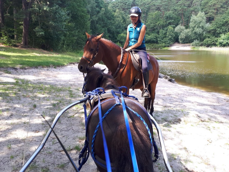Wir sehen Birgit mit dem Araber Anwar beim Wassertreten an der Tränkestelle, und Katja im sportlichen Marathonwagen hinter ihrem Shetty Fritz.
