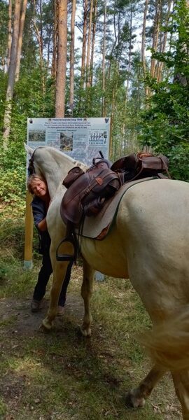Ende August brachen wir an unseren jeweiligen Heimathöfen auf zu unserem vereinbarten Treffpunkt, um von Wandlitz nach Liebenberg zu reisen. Der Weg führte uns über drei Brücken verschiedenster Bauart und am ehemaligen KZ-Außenlager Klinkerwerk vorbei. Nach gut 40 km fanden wir, wie verabredet, alles für unsere Pferde und uns vorbereitet am menschenleeren Zielort vor. Auch der Zahlencode für das Eingangstor funktionierte problemlos. Dank des liebenvollen und bereitstehenden Trossers war auch unsere Verpflegung gesichert.