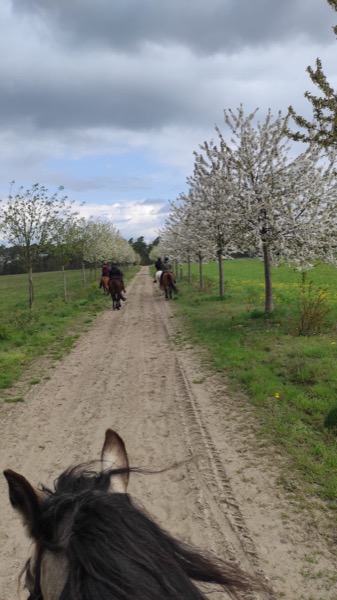 Die Runde konnte dann je nach Lust und Laune über Gadsdorf und Saalow erweitert werden. Am Dienstag ritten wir über die gerade schön blühende Kirschallee in Richtung Nunsdorf, Märkisch Wilmersdorf, Wietstock und durch den schönen Werbener Wald zurück zum Kayserhof.
