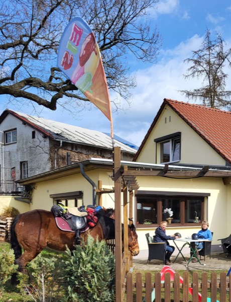 Am nächsten Tag ritten wir auf schönen Waldwegen weiter und gelangten über eine Radfahrerbrücke über die Autobahn und direkt zu unserer Mittagspause beim Colbitzer Eismann. Wir durften die Pferde auf der hauseigenen Wiese parken und wurden direkt neben dem Anbindeplatz verköstigt.