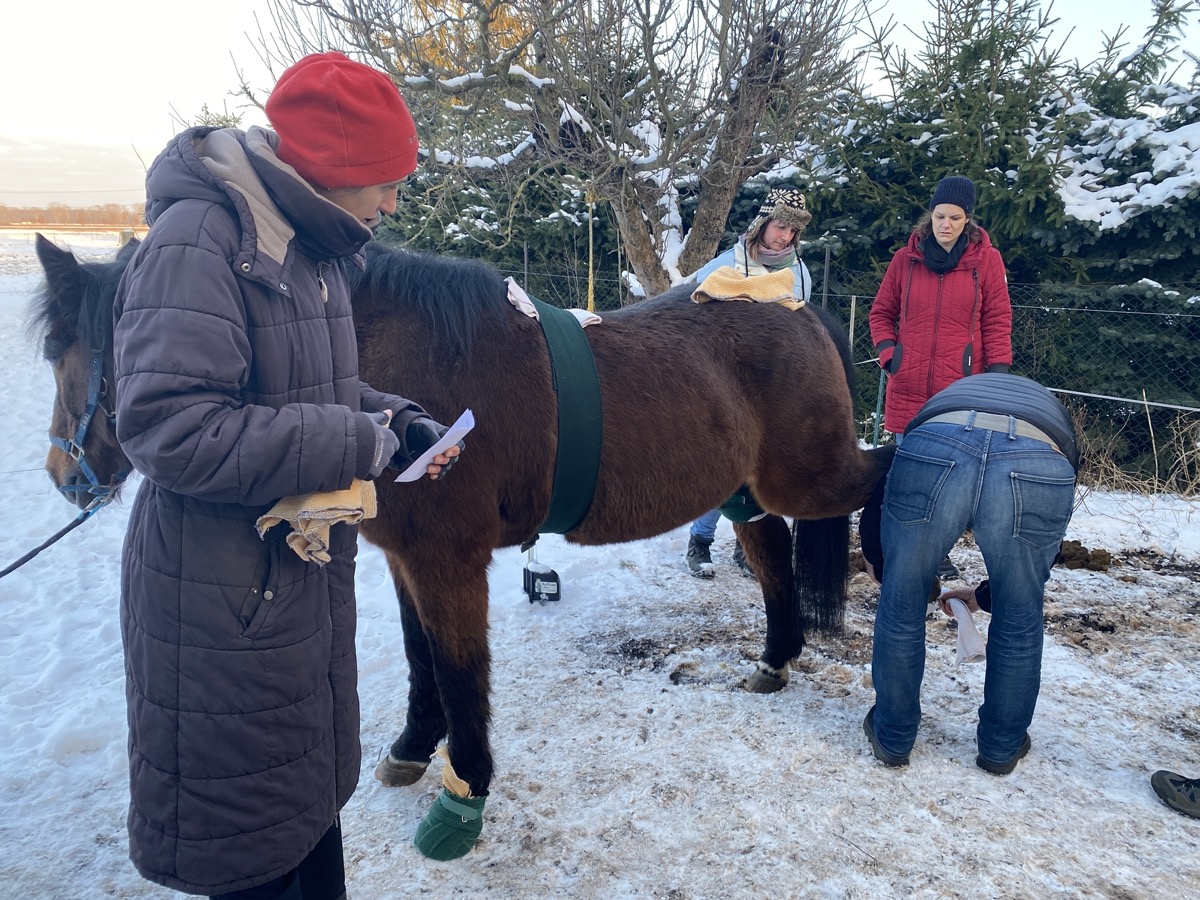Wir durften die „Profipferde“ von Frau Dr. Hueber unter die Lupe nehmen: horchen, fühlen, beobachten, messen und sogar Verbände an allen möglichen Stellen setzen.