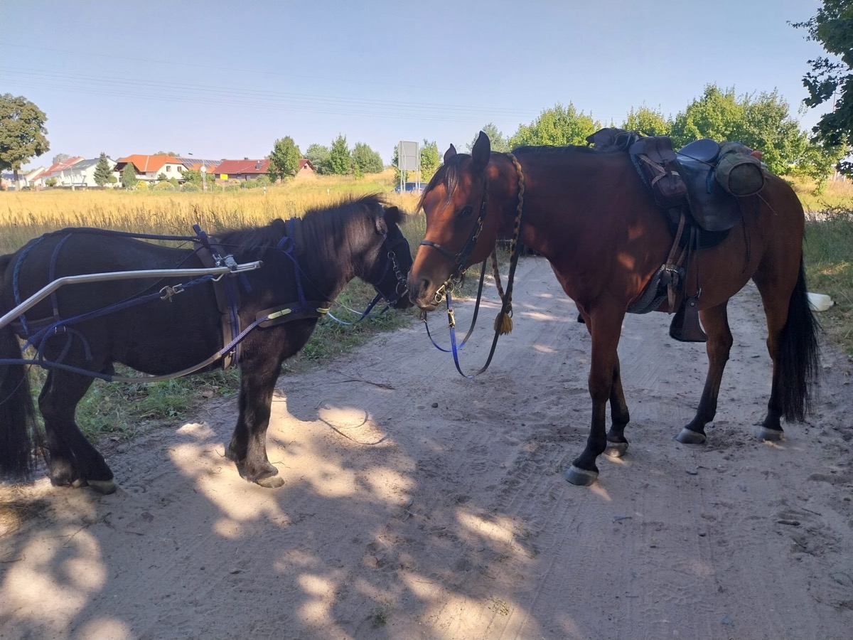 So entschied Rittführerin Birgit Groth, unterwegs auf dem ägyptischem Araber Anwar, dass die zuvor ausgearbeitete Strecke am besten im lockeren Distanztrab oder Jog zu bewältigen sei. Katja Kropp hatte ihr zuverlässiges Shetland Pony Fritzi vor den Sulky gespannt und Nina ritt den Arabermix Cielo.