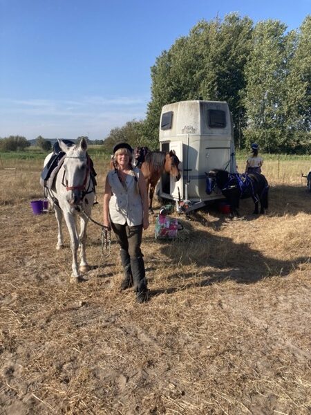 Unser großes Glück bei Temperaturen über 30 Grad war, dass Regina Porrmann bereits die Paddocks und iihren Hänger als Futterlager und Sattelkammer für uns aufgebaut hatte. So langsam konnte sich das Reiterlager-Feeling einstellen, man sitzt mit hochgekrempelten Reithosen im Campingstuhl und beobachtet das Eintreffen der anderen Teilnehmer… oder hat schon alte Freunde wieder getroffen.