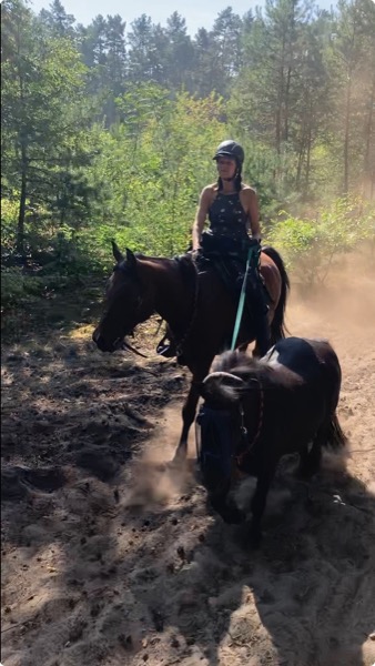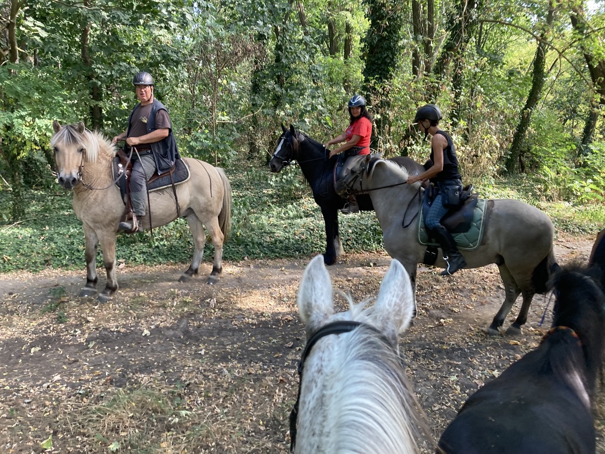 Nach Einritt in einen großen Mischwald trafen wir auf eine neue Prüfungsaufgabe: hier waren kognitive Fähigkeiten gefragt, nämlich Stadt-Land-Fluss zu Pferd und gleichzeitig mit Vorwärts- und Rückwärts richten, um beide Gehirnhälften anzuregen.