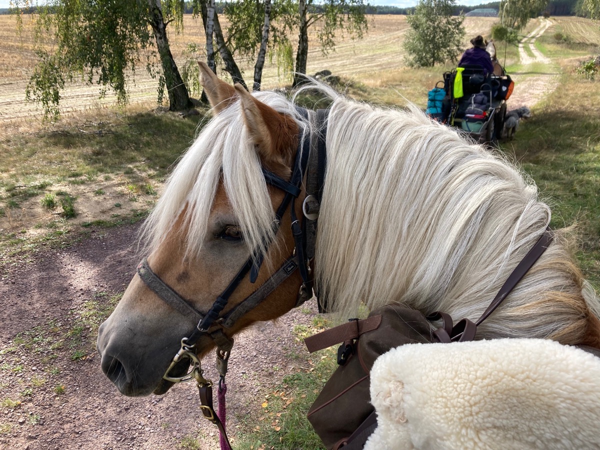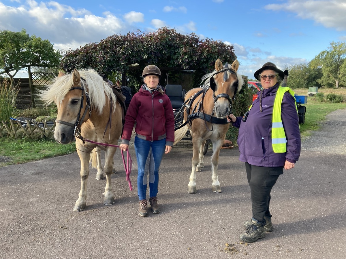 So kam sie mit ihrer Stute Ally McBeal und dem Haflinger-Wallach Sauron in der letzten Septemberwoche in den Naturpark Hoher Fläming in Brandenburg. Die Stute spannt Sabine vor einen Trainingswagen, während der Wallach an der Hand oder als Reitpferd mitkommt.