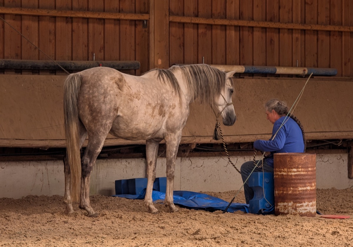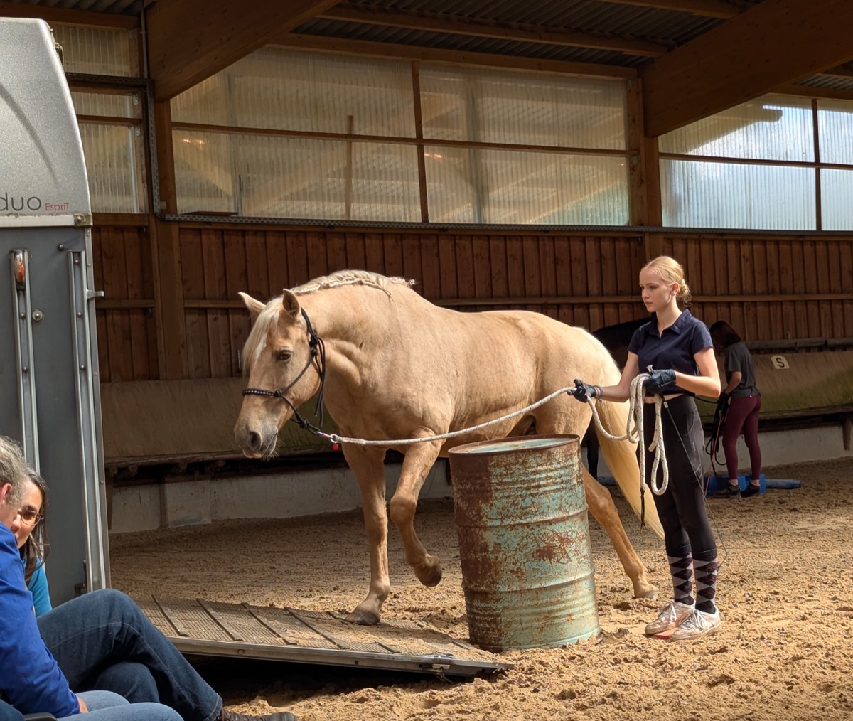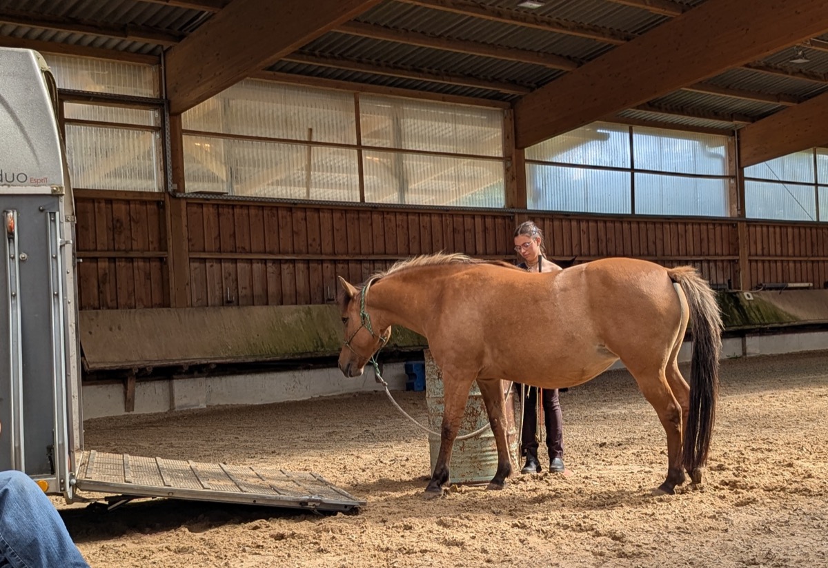 Die ersten vier Pferde prüften und verbesserten am Samstag Vormittag ihren Mut dem Menschen, der Ausrüstung und einigen kleinen Hindernissen gegenüber. Wir verbesserten das Verständnis für Hilfen am Seil, bewegten die Vor- und Hinterhand und konnten den Pferden schließlich auch die Angst vor der Rampe nehmen, sodass alle Vierbeiner vor der Mittagspause ruhig, mutig und konzentriert quer über die Rampe gehen konnten.